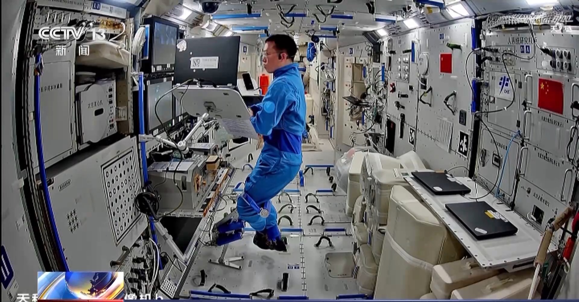 完成一系列准备使命,张陆登上机械臂,在武飞的协助下完成确立传递,机械臂向神舟二十号飞船转移,航天员张洪章在空间站天和中枢舱内撑捏合营。
