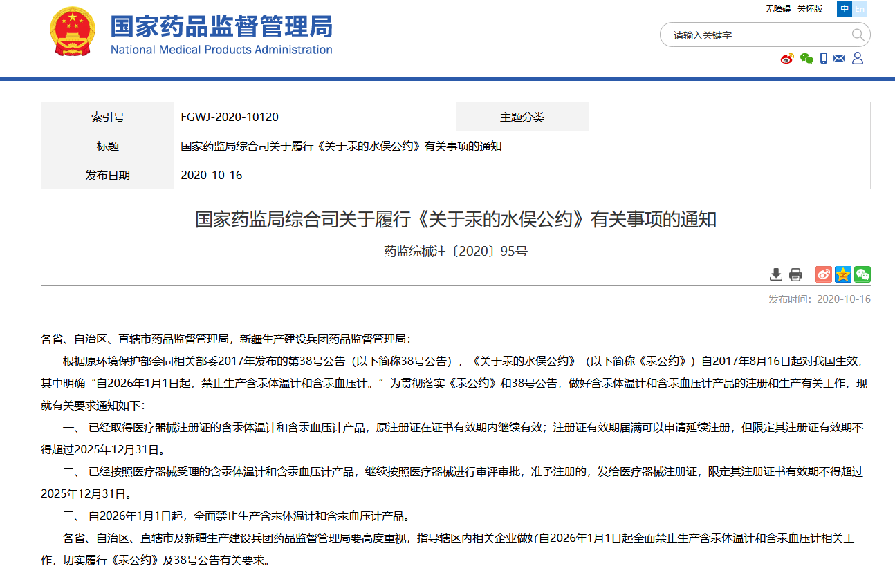 2020年,国度药监局概括司发布对于奉行《对于汞的水俣合同》推敲事项的见告,其中明确“已赢得医疗器械注册证的含汞体温计,注册证有用期届满后不竭注册不得跳跃2025年12月31日”,为产业转型和商场过渡预留了饱和时辰。